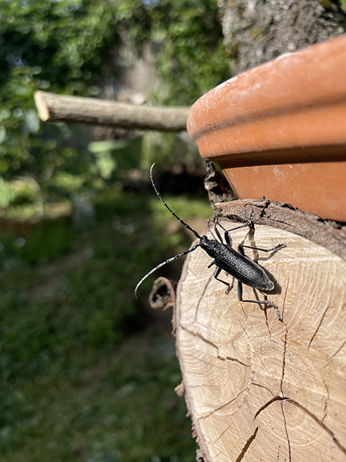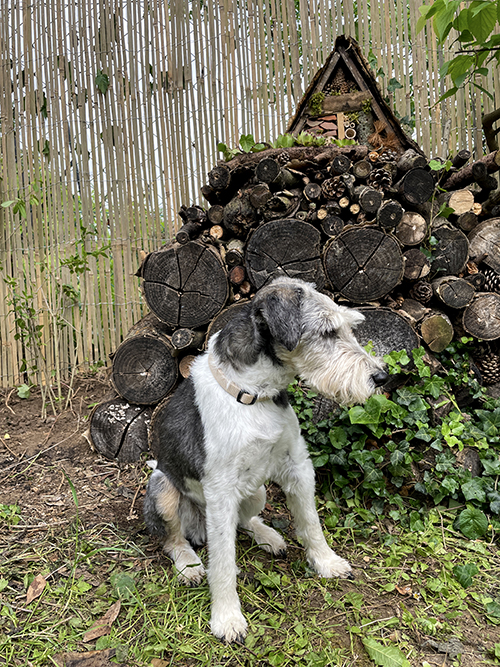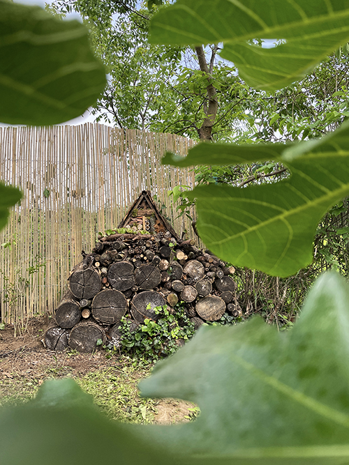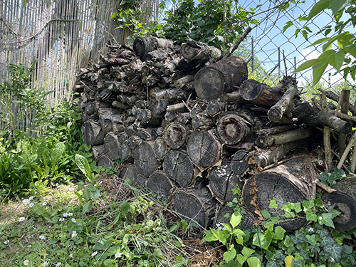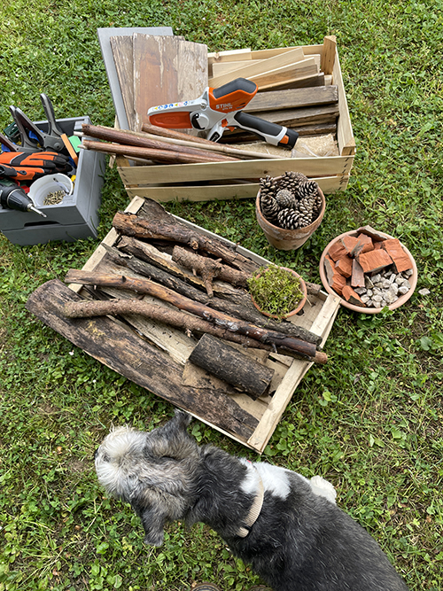 A rovarhotel helyén nem is kellett sokat gondolkodnom. A növényekkel teleültetett rézsű közvetlen közelében, a meggyfán kialakított madáretető és itató (ITT írtam róla) melletti sarkot szemeltem ki, ahol pár napja még ezek a farönkök voltak felhalmozva.