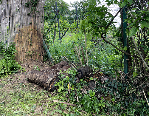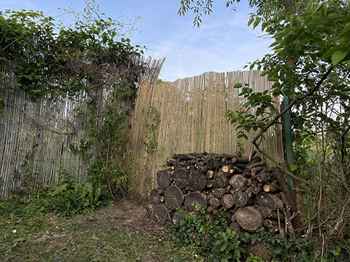 A rovarhotel szempontjából fontos, hogy amennyire csak lehet szélvédett részre tegyük azt, így első lépésként lebontottam a farakás nagy részét, és feltettem egy bambusznád belátásgátlót a drótkerítésre.