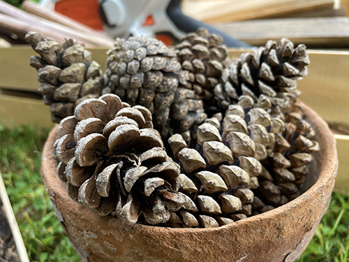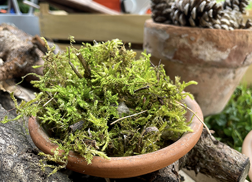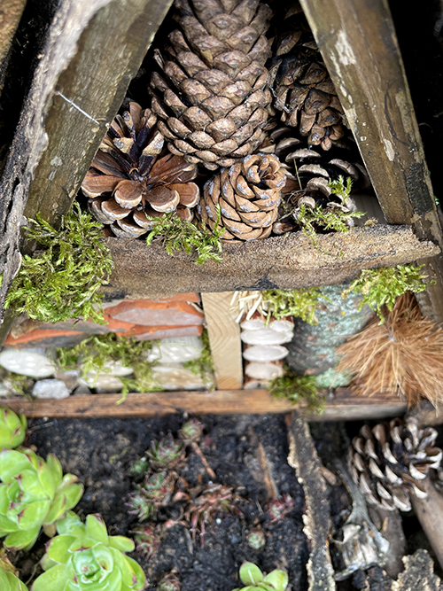 A felső emeletre tobozokat raktam, de hogy ne potyogjanak ki (időjárástól függően összezáródnak vagy éppen szétnyílnak), kaptak egy kis korlátot is lécből, amire fakérget raktam takarásnak. Kis mohával díszítettem az egészet, illetve ez jó arra is, hogy a rögzítő csavarokat elfedje.