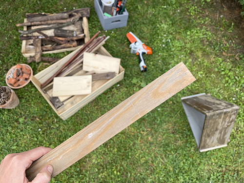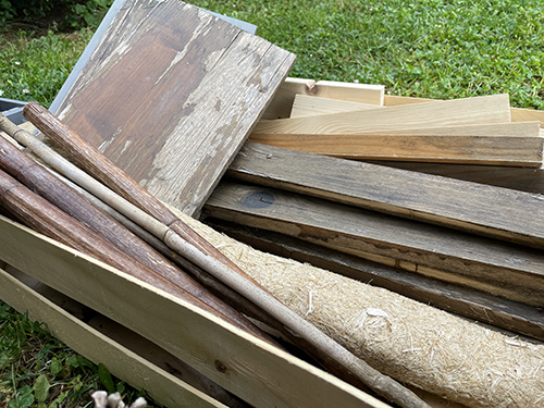- Korábbi barkácsolásokból lehulló fenyődeszkák és lécek