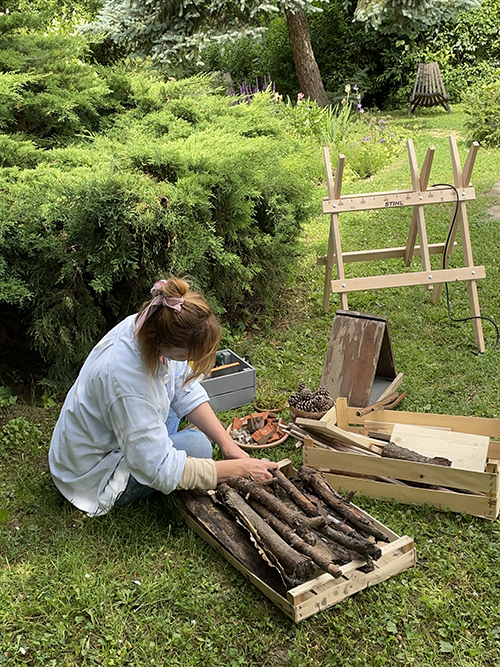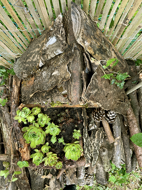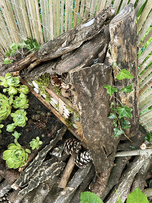 Mindenképpen szerettem volna valami módon növényeket is elhelyezni a rovarhotel követlen környezetében, így fakéreget és lebomló, természetes talajtakarót rétegeztem a farakásra, melyet ágakkal kerítettem körbe, és az így kialakított ágyásba ültettem el kövirózsákat. Idővel persze a farakáson felfele törekvő borostyán biztosan körbenövi szépen a rovarhotelt, de ez még jópár év.
