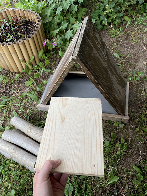 Hogy a csapadéktól is valamennyire védve legyen a rovarhotel, a tetőt még fakérgekkel is befedtem, bár mostanában olyan esőzések vannak, hogy sokszor még a terasz fedett részei alatt is hömpölyög a víz, szóval ez a megoldás sem teljesen vízálló. A rovarokra bízom ezt a dolgot, úgyis megtalálják maguknak azt a helyet, ahol jól érzik magukat.