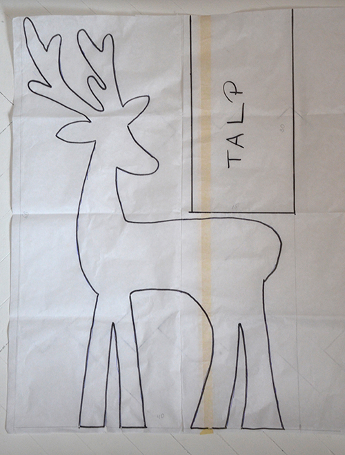 A szarvas kontúrját nem én találtam ki, hanem egy fotó alapján szabad kézzel rajzoltam meg egy pauszpapírra, 40×60 cm-es befoglaló méretben. A méret azért fontos, mert a Praktikerben pont ilyen méretben is lehet kapni fenyődeszkát, így nem kell annyit matekozni, hogy jön ki gazdaságosan a sziluett és a talprész.
