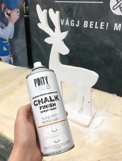 Ezután érdemes pár órát várni, aztán jöhet a sprayfesték. Én ezúttal nem alapoztam (fa dekortárgyakat rendszerint nem szoktam), csak egyszerűen Pinty Plus krétafesték spray-vel 2-3 rétegben egyenletesen átfújtam mindkét oldalt.