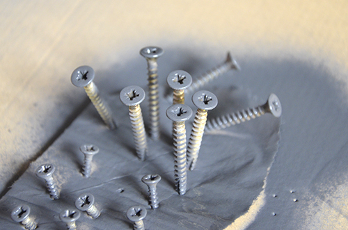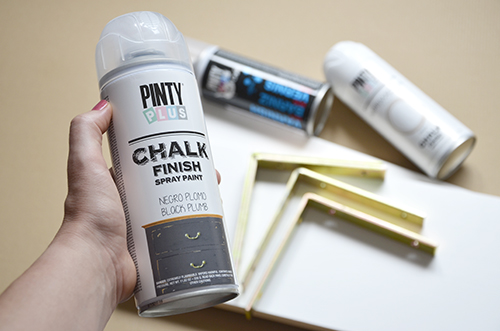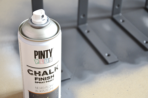 Először PintyPlus krétafesték spray alapozót használtam (a jobb tapadás érdekében), ami nem csak fémre alkalmas, hanem szinte bármilyen felületre, de fémen még a rozsdásodást is gátolja. Egy óra várakozás után jöhetett a fekete krétafesték spray, ami valójában szürke – saját lakkjával befejezve enyhén kékesszürke – árnyalatot eredményez, és én pont emiatt szeretem.