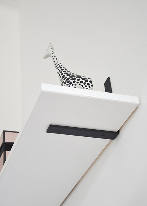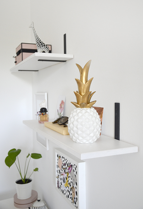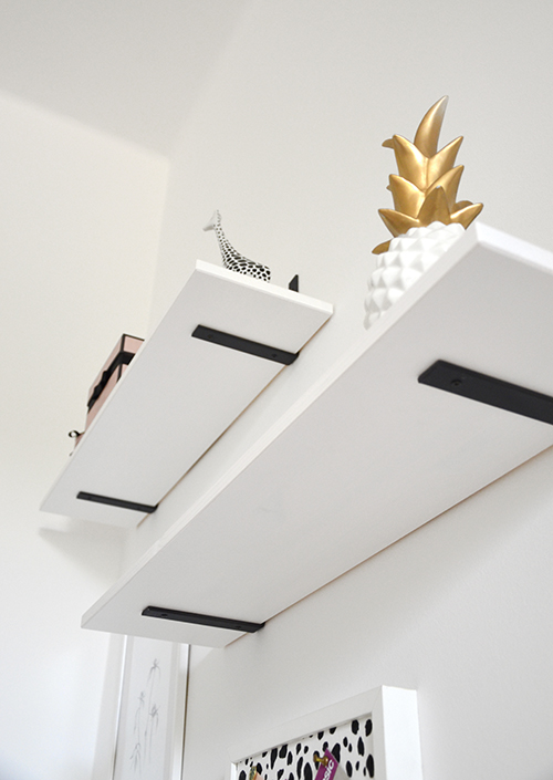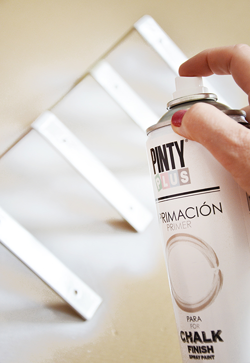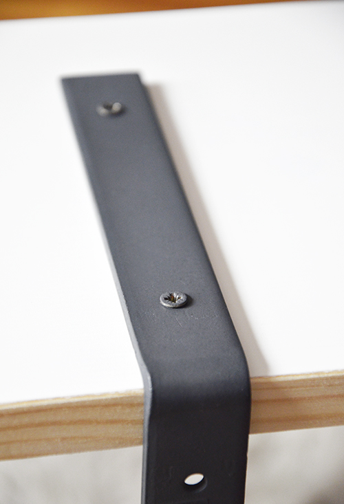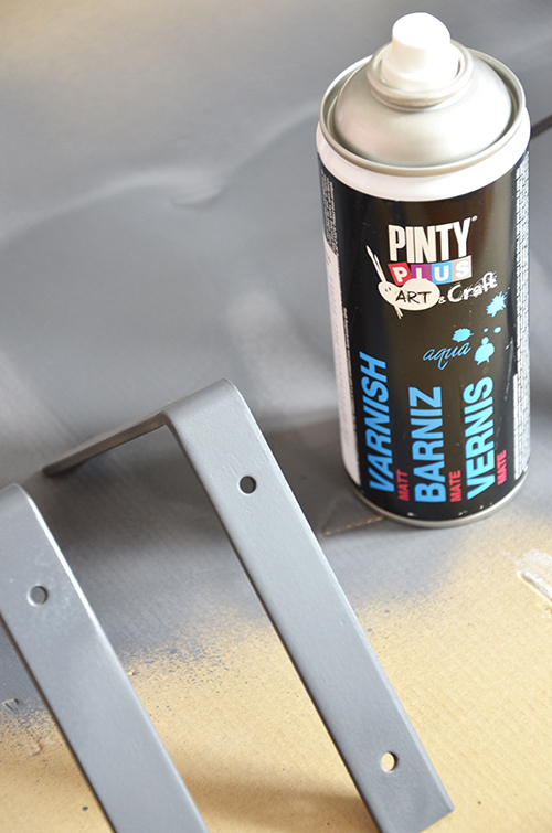 Így végül vettem két fehérre pácolt 80 cm-es könnyed fa polcot (Ikea – Hemnes, így tökéletesen passzol az asztalomhoz), valamint 2-2 horganyzott szegletvasat a Praktikerben. Előkaptam a sprayfestékeimet, és a sárgás színű elemeket egyszerűen átfújtam.