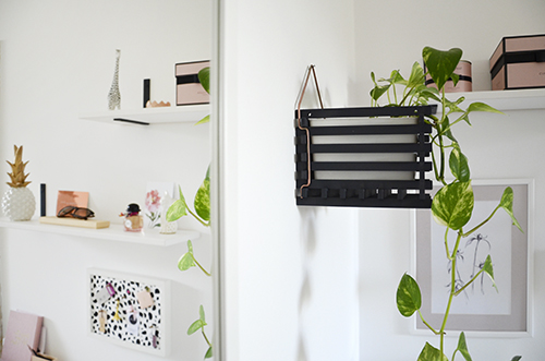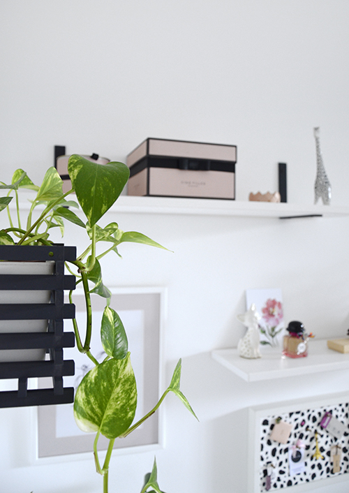 Egy ideig agyaltam, mi is kerüljön pontosan a falra, mert egyrészről nem akartam túlzsúfolni a felületet, másrészről viszont szükségem volt olyan pakolós részre, ahova ezt-azt kirakhatok, mondjuk dísztárgyakat, vagy olyan dolgokat, amik a munkámhoz szükségesek (pl. stylingra, fotózásra váró tárgyakat). Nagy betűző táblát sok fecnivel nem akartam, és zárható, szekrény típusú megoldást sem.