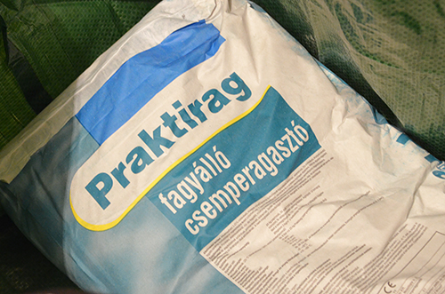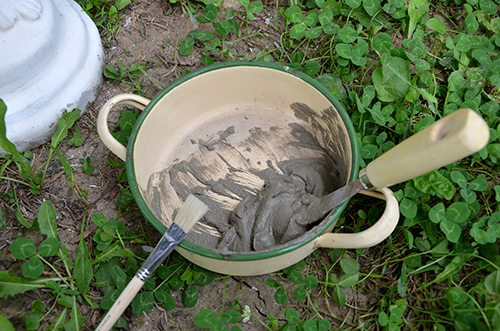 Amíg teljesen megszáradt kikevertem a fagyálló csemperagasztót. Ezt tulajdonképpen egy olyan ragasztó habarcs, ami beltéren és fedett kültéren fagyálló kerámia járólapok ragasztására alkalmas. De természetesen minden részletesen le van írva a termék papírzsákján. A 25 kg-s zsák 1000,- Ft körül mozog, és mivel amúgy is kellett vennem a kisebb betonrepedések esztétikai és praktikus eltüntetéséhez (erről későbbi bejegyzésben ejtek még szót), így hát gondoltam kipróbálom, mennyire válik be műkő szobor javításához.