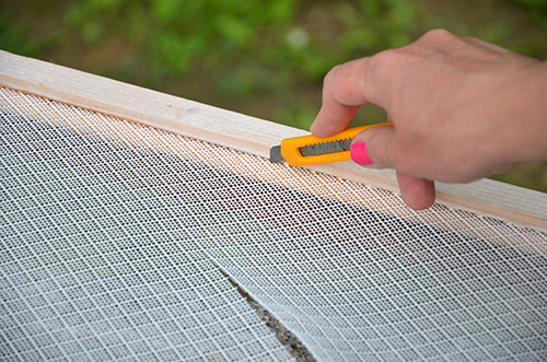 Mivel maga a keret tökéletes állapotban van, és takkra illeszkedik az ablakkeretbe, így azt nem is bántottam. Mivel a régi háló ragasztóval és egy szögekkel rögzített léccel feszült a keretre, így a legegyszerűbb megoldásnak azt láttam, ha sniccerrel választom le. Nem akartam a szögelt keretet felfeszegetni, tartottam attól, hogy elreped, eltörik, és jóval több munkát vennék a nyakamba, mint szükséges.