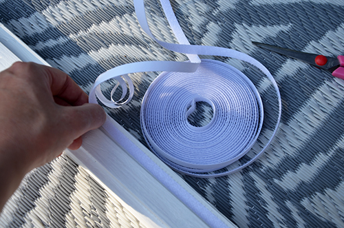 A háló egyik sarkát a helyére illesztettem (ügyelve, hogy tényleg merőlegesen legyen levágva) és rásimítottam a rögzítőszalagra.