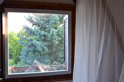 Az ablakkeretbe illesztve is klassz, a fehér hálón át nem láttam így ki. Most szinte olyan, minta ablaküveg lenne, vagy nyitva lenne az ablak.