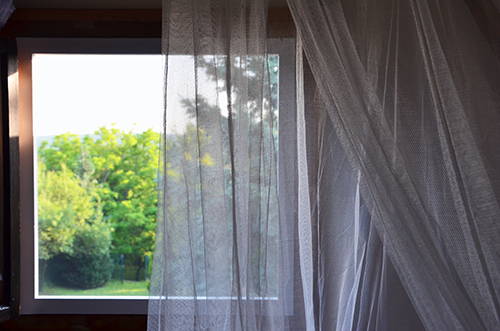 Kívülről is majdnem úgy fest, mintha ablaküveg lenne. A képen látható, hogy az alsó részen a középső teraszajtó nyitva van, itt egy tüllös függöny lóg, amin keresztül könnyen lehet közlekedni, a repülő rovarokat viszont kint tartja. Este, világításnál ez mindig be van csukva, olyankor a lenti ablakok vannak nyitva, azokon fix szúnyogháló van.