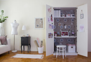 A szoba sarkában pedig a gardrób kapott helyett, a költségtakarékosság jegyében egyszerűen egy függönnyel eltakarva.