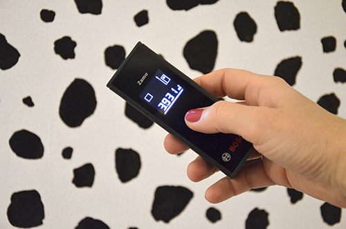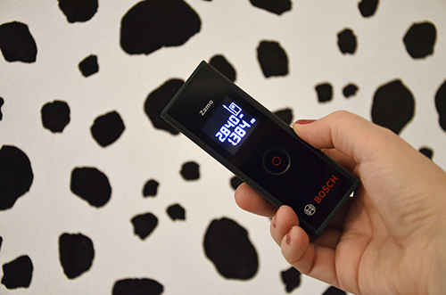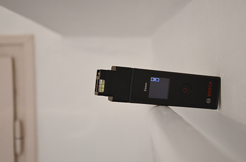 Első lépésként felmértem a beugró falrészt. Ehhez a Bosch Zamo multifunkcionális lézeres távolságmérőjét használtam. Egy-egy gombnyomással meg is volt a szélesség és a magasság, amit a digitális kijelzőről rögtön le is tudtam olvasni: