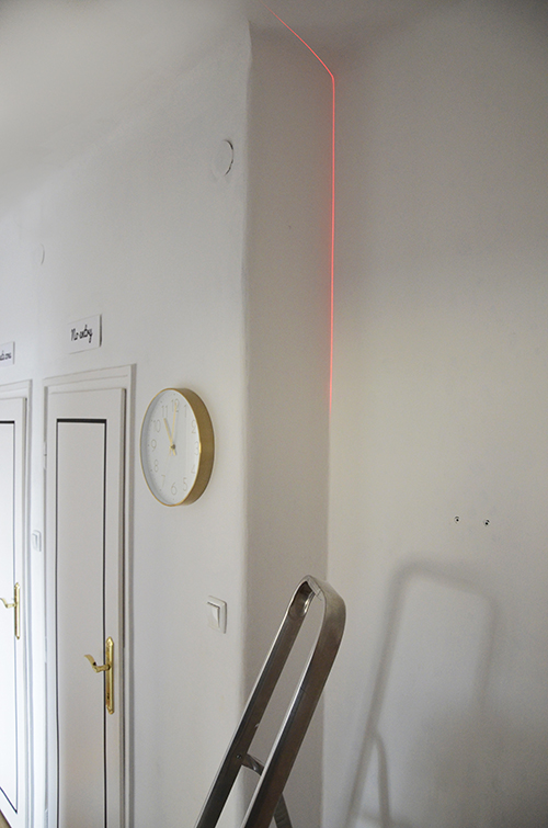 Ehez ugyancsak a Bosch Zamot használtam, ezúttal viszont egy szintezőadaptert csatlakoztattam a tetejéhez, amivel így könnyen lehet függőleges, illetve vízszintes irányt kijelölni. A Zamot a nemrég lefestett gázcsőre fektettem (ITT), a vízmérték segítségével pedig beállítottam, hogy a szemközti falon a sarokban valóben függőlegesen fusson a lézercsík.