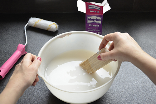 A tapétaragasztót a dobozon leírtak szerint bekevertem, és amíg pihent „kijelöltem” az első tapétacsík helyét.