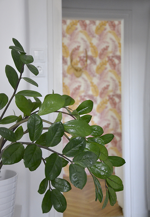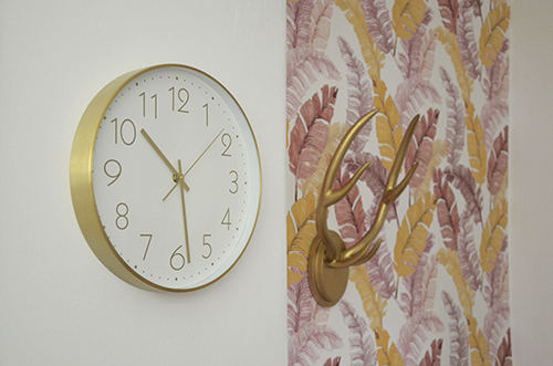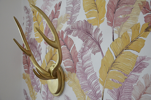 Az arany agancs fogas visszakerült, ami tényleg rendkívül praktikus, mert pont annyira áll el a faltól, hogy a ráakasztott kabátok, táskák nem koszolják össze a felületet. Haha, az sem zavar, hogy nem annyira trópusi motívum, szerintem jól mutat.