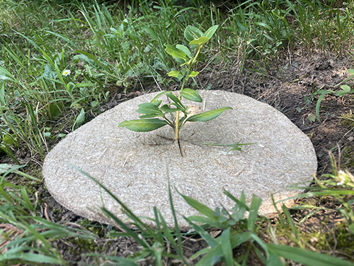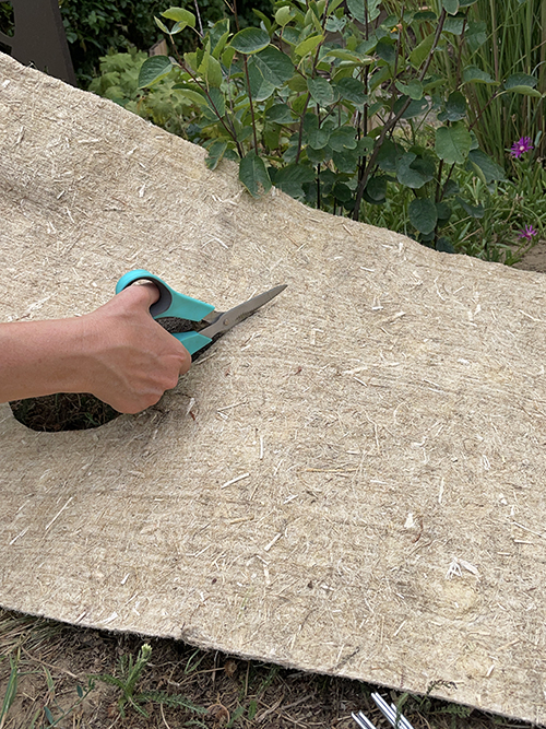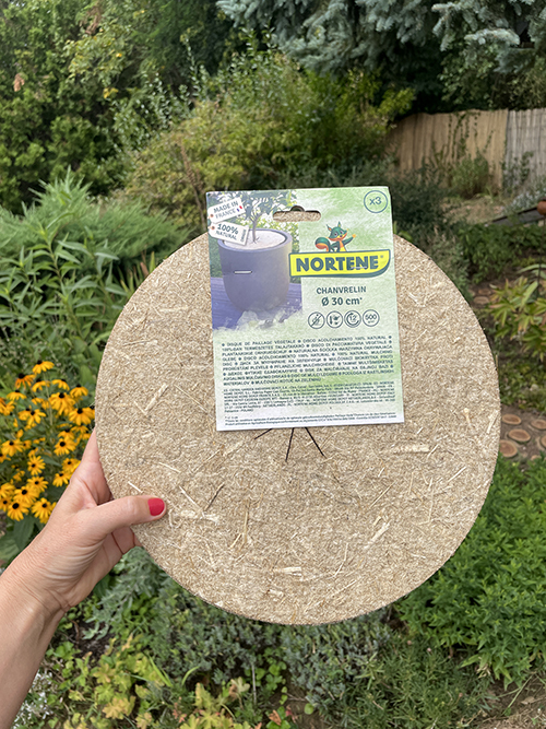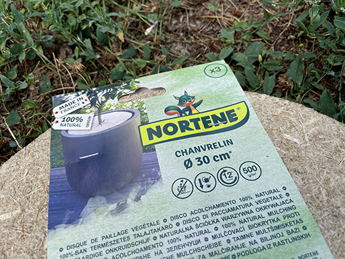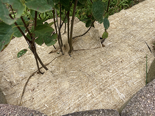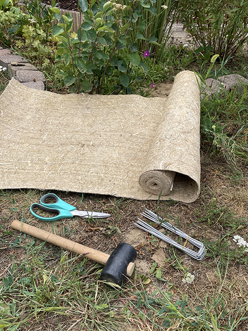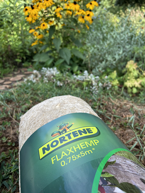 Friss ültetésekhez, kisebb növényekhez kezdtem el tavaly használni a természetes anyagok (kender és len) keverékéből álló, idővel lebomló talajtakarókat. A tapasztalataim alapján (ITT írtam róluk először) nagyon jól teljesítenek, ezért idén a fent leírt mulcsolások mellett ezeket is alkalmazom célzottan egy-egy növény védelmére, vagy adott szakaszon, ahol a takaró aljnövényzet még hiányzik.