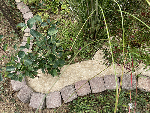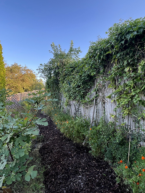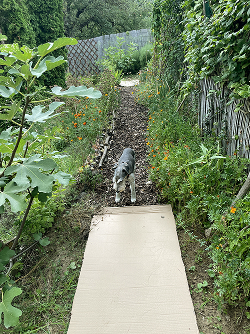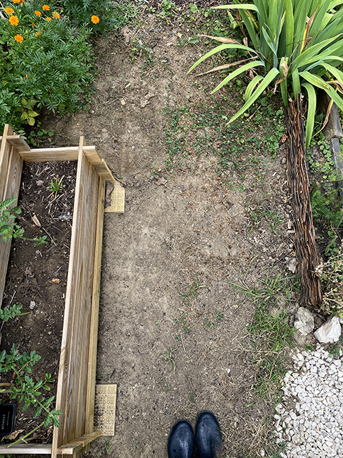 Ez a kis ösvény nagyon praktikus amikor a kerítést drótozom, amikor a mellette lévő növényeket ápolgatom, amikor a rézsűs ágyást innen fentről öntözöm.