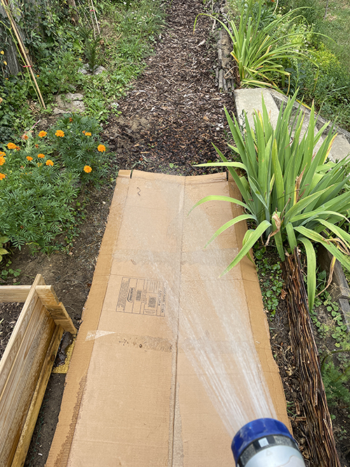 Ezután jöhetett a belocsolás. Igazából erre azért van szükség, mert a karton megpuhul, elveszti merevségét, és a fenyőkérges takarás után az alatta lévő maradék gyomok gyakorlatilag kirohadnak.