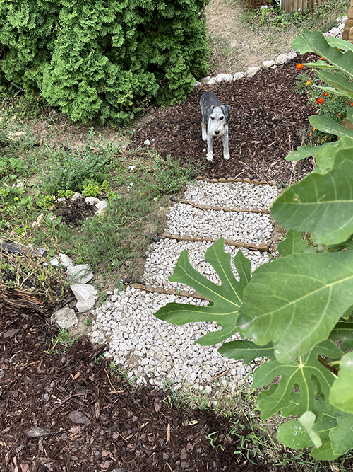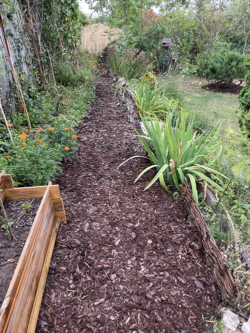 Most tavasszal pedig kapott egy vastag réteg fenyőkéreg mulcsot, amit már több fotómon is láthattatok. Viszont a kis ösvény két vége hiányzott, hiszen akkor még nem voltak meg a lépcsők, még nem láttam magam előtt, hogy is fog majd összeérni a két rész, ezért úgy voltam vele, hogy majd az idei lépcsőkészítés után fejezem be a maradék, nagyjából 2-2 méteres szakaszokat.