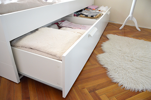 Takarítással együtt 3 óra volt, mire az új ágyamat a helyére raktam. Kifejezetten olyan típust kerestem magamnak, aminek NINCS ágyvége, hisz van egy remek diy ágyvégem (ITT), amit ehhez is jól odailleszthetek. A másik fő szempont volt, hogy legyen ágyneműtartója, lehetőleg fiókos, amibe nem csak ágyneműt rakhatok, de egy csomó olyan dolgot is, amit eddig szekrényben tartottam.
