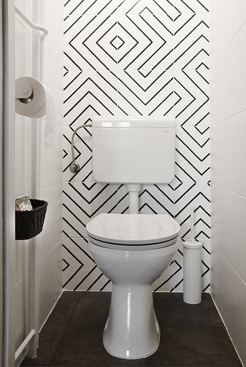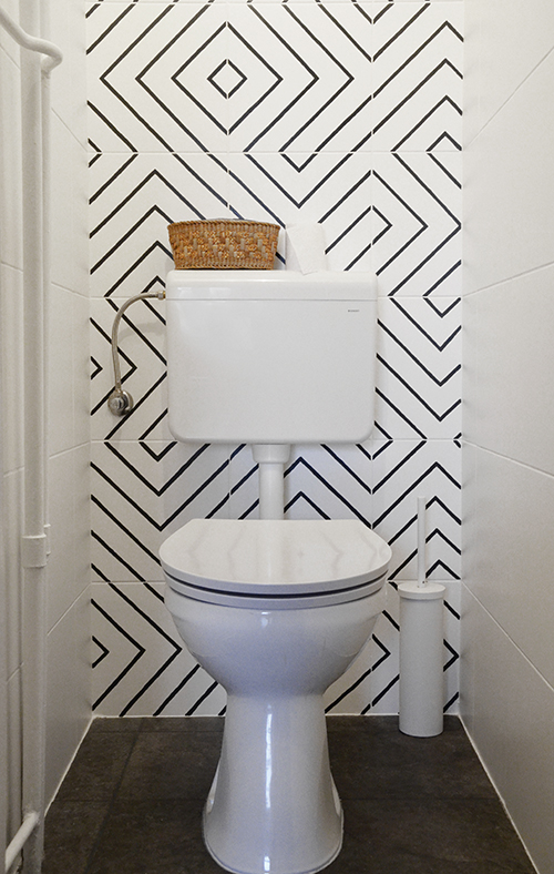 Ennek a kis helyiségnek a korábbi állapotáról ITT írtam, a kisebb-nagyobb munkálatokról ITT, a csempe festéséről ITT, és végül a fűtéscső átfestéséről ITT. Ezekkel a munkálatokkal egészen megváltozott a wc kinézete: