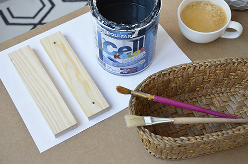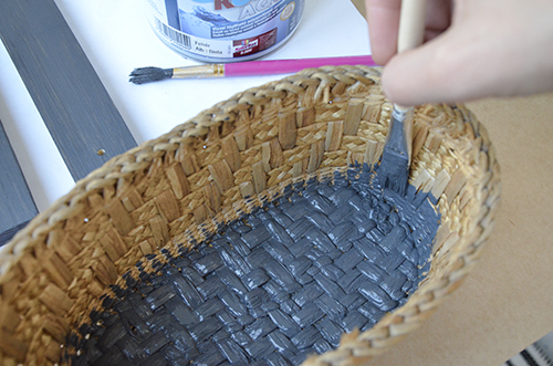 Alapozót ezúttal nem használtam, mert sem a tartólécek, sem a kosár nem lesz komolyabb mechanikai igénybevételnek kitéve (aminek során lekophatna a festék) , így ezt most megspóroltam. A léceket két rétegben kentem le, a kosárnak elég volt egy. Fontos megjegyeznem, hogy alap esetben minden fonott, szőtt felületet inkább sprayfestékkel érdemes fújni (gyorsabb és szebb az eredmény), de én nagyon szerettem volna, hogy a kosár színe és fénye pont olyan legyen, mint amilyen a léceké, illetve a csempecsíkoké, így bevállaltam a pepecselést.