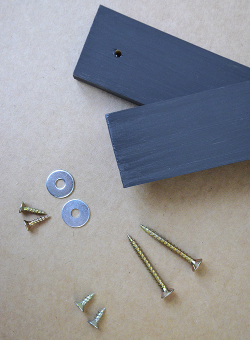 Az elemek rögzítéséhez összesen 3 különböző méretű csavart használtam. A leghosszabbakkal rögzítettem a kifúrt elemet a falra, ezeknek a fejét később le is festettem szürkére, hogy kevésbé látszódjanak. Az egészen kicsi, de tömzsi csavarokkal raktam rá a wc papír tartót. Ezeknek a helyét nem kellett előfúrni, mivel csak félig mélyedtek a fába. A vékony kicsi csavarokra pedig 1-1 alátétet raktam, és ezekkel együtt rögzítettem a kosarat a tartólécre.