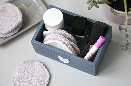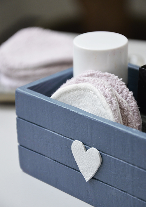 A ládika funkciója nem változott, most is fürdőszobába való dolgokat fogok benne tartani, de jön velem a faházba azokkal a textilből varrt korongokkal együtt, amiket már láthattatok a blogon ITT.