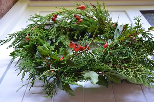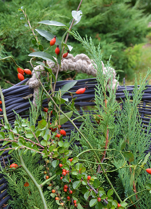 Aztán tettem egy kört a kertben és gyűjtöttem néhány növényt a kosaramba. A zöld szín és a piros bogyók miatt valóban kicsit karácsonyi jellegű a dolog, de nem zavar, hamarosan úgyis lehet készíteni a karácsonyi dekorációkat is.