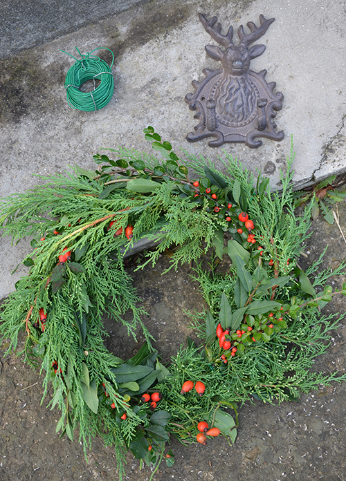 Két hosszú, vékony, rugalmas, leveles gallyat sodortam egymásba és erre rögzítettem körbe az ágakat. A kúszófenyő levelei meglehetősen szúrtak, így kesztyűben dolgoztam és ezeket az ágakat több helyen dróthuzallal rögzítettem az alaphoz.