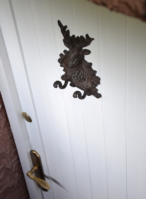 Anyukám egy régiségboltban akadt rá erre a szarvasos akasztóra, ami egyébként az előszobában is megállná a helyét (vagy bárhol a faházban), a pinceajtón viszont nemcsak mutatós, de az éppen aktuális koszorút is könnyen rá lehet akasztani.
