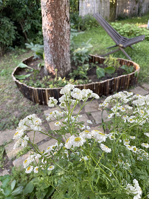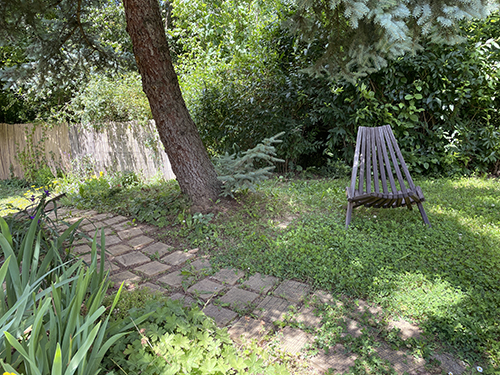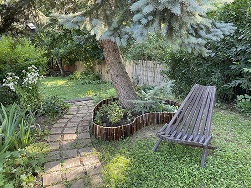 Később vetettem fűmagot, meg kialakítottam mellette egy kerti utat keramit lapokból, viszont a fenyő alá nem igazán tudtam ültetni semmit a földfelszínhez közel futó erős gyökerek miatt. Néhány illatos gólyaorr árválkodott itt.
