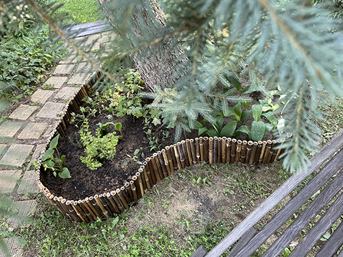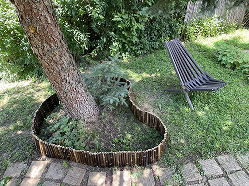 Fogtam hát néhány bambusz szegélyt, és körforma helyett kissé szabálytalan elrendezésben körbekerítettem a törzset. Ez a fenyőfa egyébként nagyon ferdén nő (sajnos két nagy bálványfa nyomta egyik oldalról, míg ki nem vágattam őket), az egyik fele rendesen fel is volt kopaszodva, mostanra valamennyire összeszedte magát. És azóta nő az oldalán is egy újabb fenyőág, amit én egyelőre nem vágok le, jól mutat. Szóval már csak a ferde forma, és a kiálló kis ág miatt is törekedtem a játékosabb kialakításra az ágyásszegéllyel.
