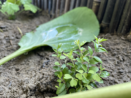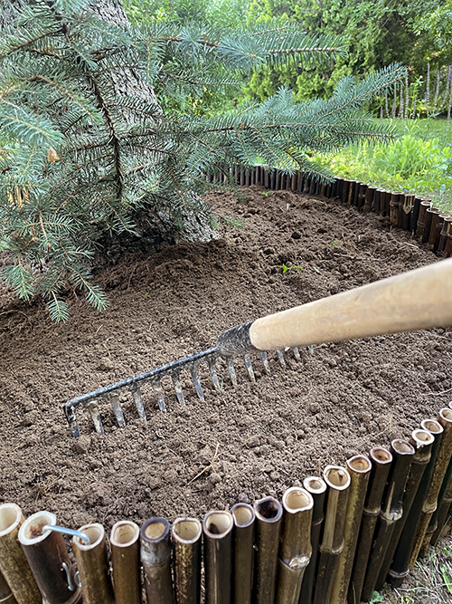 Miután minden egyes bambusz a helyére került, az általuk határolt ágyásba lapátoltam földet, amibe egy kis gereblyés igazítás után jöhettek a növények is: gólyaorr, gyöngyvirág, különféle árnyékliliomok, bőrlevél, tüdőfű, nefelejcs, mirtuszlonc és madárbirs.