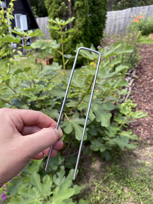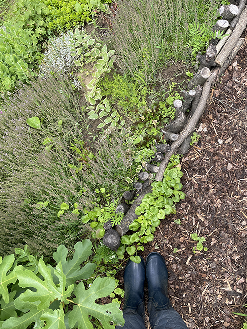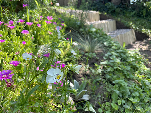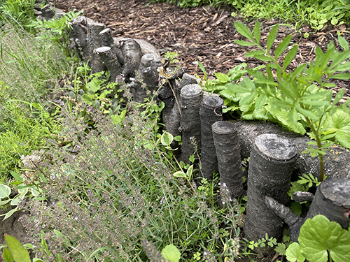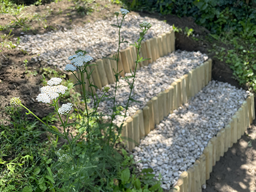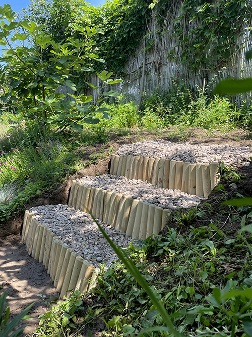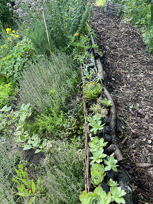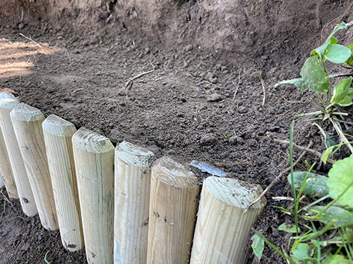Szóval ezek a cölöpök egyrészről jól mutatnak, másrészről kicsit megfogják az ásóval megdolgozott földet, harmadrészről az ösvényen lévő vastag fenyőkéreg mulcs sem vándorol le idővel a rézsűn. De már akkor volt egy elképzelés a fejemben, hogy milyen jól nézne ki, ha ezen a kis elválasztó sávon is lenne valamilyen módon növényzet.
