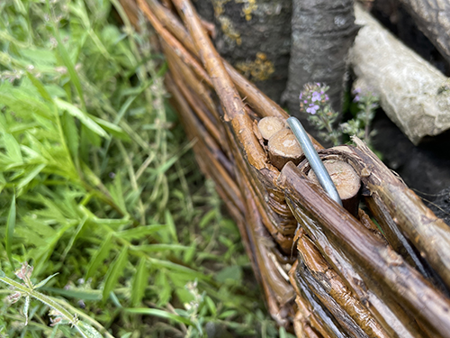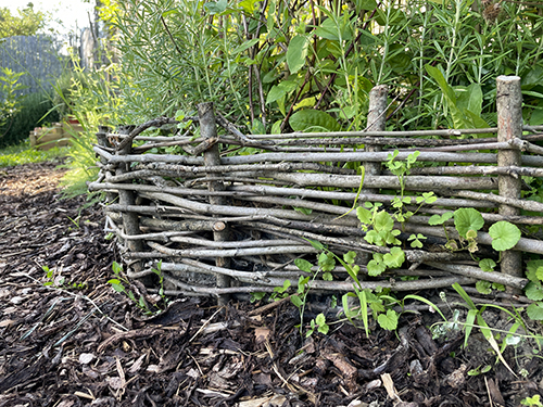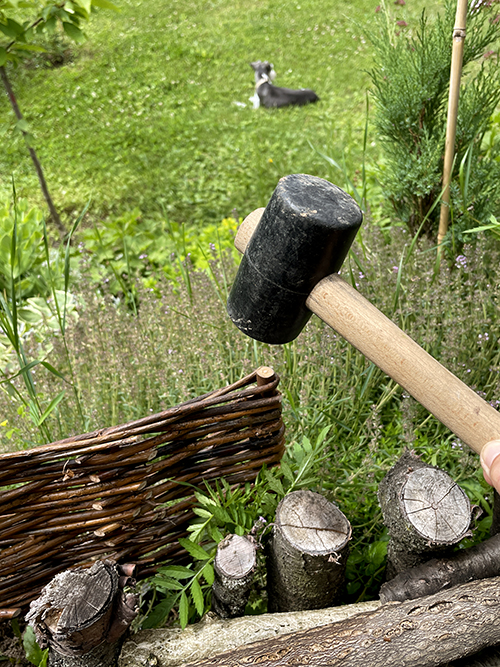 Ezt a típust a virágos rézsűm tetejére álmodtam meg, a kerítés mellett kialakított ösvény és a növények között. Amikor tavaly ilyentájt a rézsűt kezelésbe vettem (ITT), és később a fenti részén kialakítottam egy ösvényt (ITT említettem), akkor a szélére a régi meggyfa levágott ágaiból vertem le cölöpöket.
