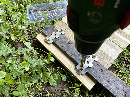 Ha elölről támasztom meg, az nem túl esztétikus, bár kétségtelenül az a legbiztosabb módszer. Én az ágyásszegély hátoldalára perforált szalaggal (ismertebb nevén hiltiszalag) rögzítettem hosszú, lapos vasakat, amiket előtte méretre vágtam.