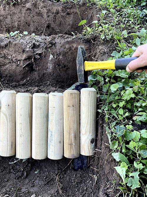 Nos, ennek érdekében a cölöpök elé szép sorban gumikalapáccsal ütöttem le az 1 m széles Wilborder ágyásszegélyeket, de persze, ha elég puha a föld, egyszerűen kézzel is le lehet ezeket nyomni.