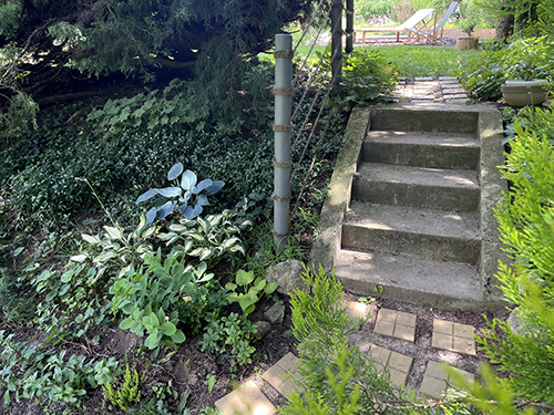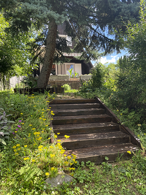 Itt a faháznál a telek teraszos elrendezése miatt eleve van egyfajta játékosság a térben, amit a meglévő lépcsők mellett saját DIY lépcsőkkel is színesítettem. Nézzétek csak, itt van egy az eredeti lépcsők közül: