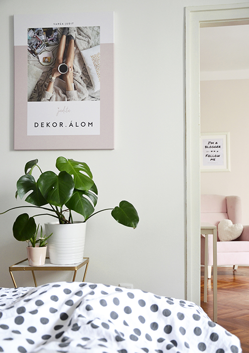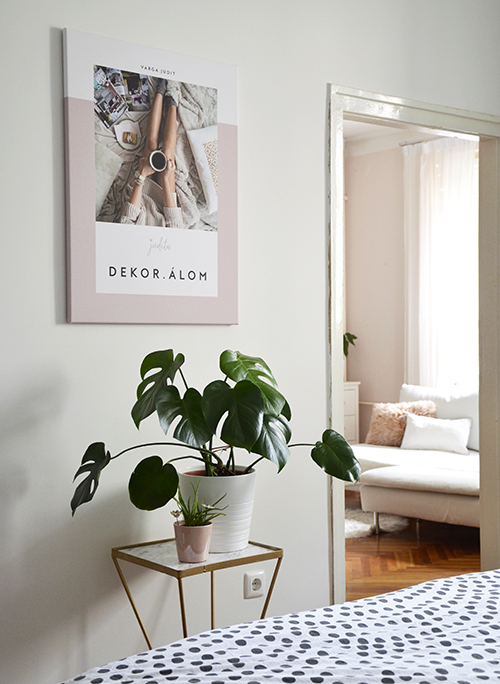 A kép végül mégsem a nappaliban, hanem a hálószobában kapott helyet (az ággyal szemközti falon), ott ahol DEKOR.ÁLOM-ra hajtom a fejemet, értitek, hahaha. Egyszerűen szebb a púder a hófehér falon, tökéletesen harmonizál a háttérben lévő nappali színeivel. Nem biztos, hogy pont ezen a falfelületen fog véglegesen maradni, de az tuti, hogy a hálóban lesz a helye. Ez még sokmindentől függ, pl. attól hol és milyen bútorok lesznek a hálóban az ágyon kívül és hogy lesz-e itt tolóajtóm…