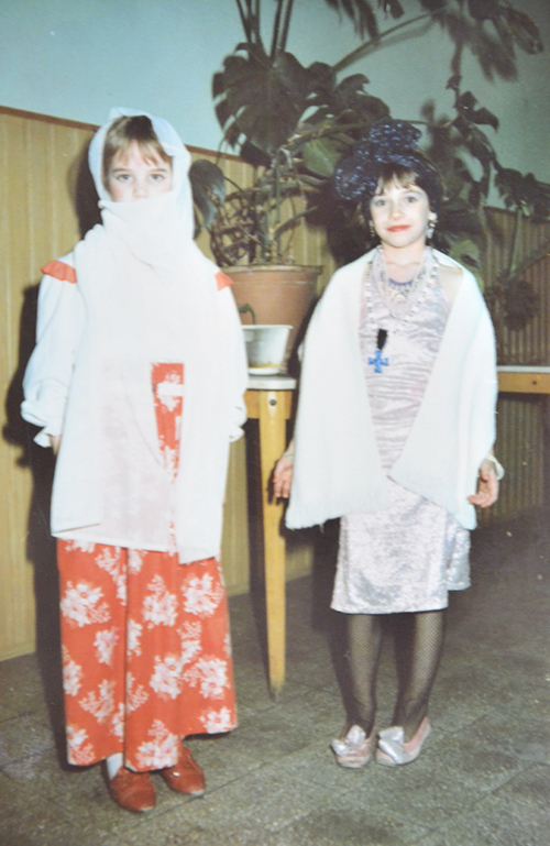 Amikor a 2. osztályos farsangra készültem egyértelmű volt, hogy én Madonna leszek! Anyukámmal kimentünk a Petőfi csarnokba, bolháztunk egy csillogó, gyöngyökkel kirakott darabot, amiről szépen lefejtettük a gyöngyöket, anyukám pedig átszabta nekem. Sajnos, nem látszik, de a ruha hátulján, a derék részen egy nagy masni is volt, úgy, mint az eredeti darabon a Material girl c. számban. Ebben az időben egyébként anyukám már tanítgatott kézzel és géppel is varrni, a nagymamáimtól pedig kötni és horgolni tanultam meg.
