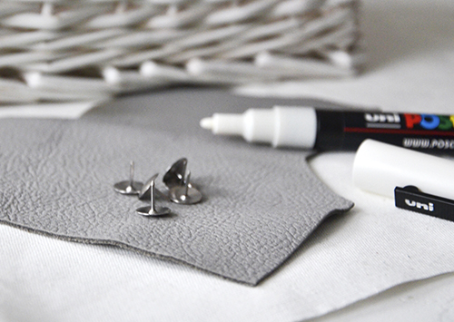 Ezekre a kosarakra ezúttal nem készítek feliratos címkét is, de ha valaki szeretne, akkor egy darab bőr, rajzszög és akrilfilc segítségével könnyedén megteheti. Ha netán a rajzszög túl hosszú lenne, érdemes lecsípni a végéből.