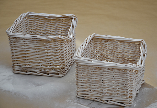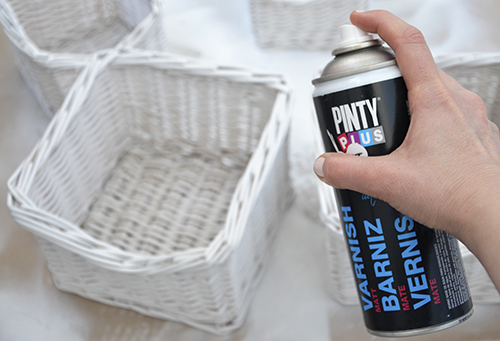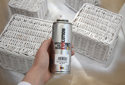 Teljes száradás után matt akril sprayfestékkel fújtám át a kosarakat minden irányból. Ebből elég volt két réteg, gyönyörűen befedte a kosarakat.