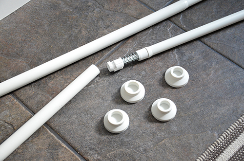 Két dolgot kellett vele csinálni: méretre vágni (ez kézi fűrésszel is egyszerűen ment) , és úgy kitalálni a rögzítést, hogy az valóban elbírjon akár több kabátot is, pl. ha vendégek jönnek és az előszobai fogason elfogy a hely. Merthogy ez a befeszítős mód valójában tényleg csak a zuhanyfüggönyökhöz és lenge függönyökhöz tökéletes. Mivel ezeknek a rudaknak a végén eltérőek a gumitappancsok méretei, ezért összepárosítottam két ugyanolyan méretet két rúdról.